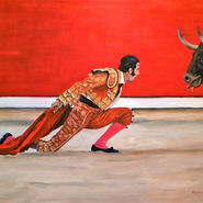 These paintings were inspired by the rich and colourful Spanish bullfights. The ritualistic contest between human and animal remains a fascinating controversy and my work aims to capture the emotion involved in this drama. Without having an opinion about the validity of this tradition, I admire this art form for its theatrical elements.This is a show in full, bold colour. The matadors' costumes called traje de luces (suits of light) are complex and adorned with embroidery, tassels and reflective beads - true works of art. The matadors' agility is unfathomable in such tight attire. These costumes are juxtaposed against the muscular strength of the fearless bulls. The red capes or muletas and the red paint of the bullrings hide the blood of the fight to the death. And it is not always the animals' blood that gets spilt. More on bullfighting.